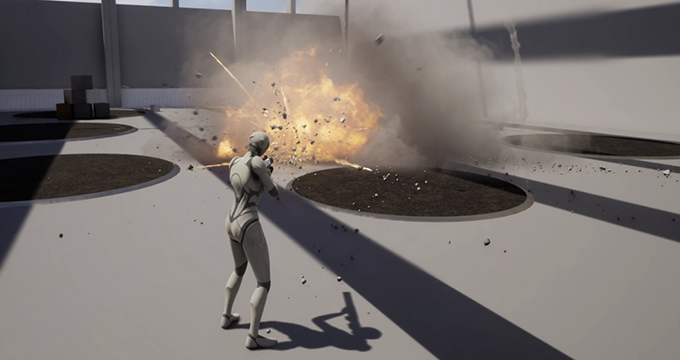 また、これらのエフェクトをゲーム内でどのように使用するかを確認できる ギャラリーレベルも含まれており、Niagara Data Channels への書き込みを行うゲームロジックの設定例や、発射物、テレポートパッド、物理インパルスと連動した衝撃システムなど、実装面の具体例も確認できます。