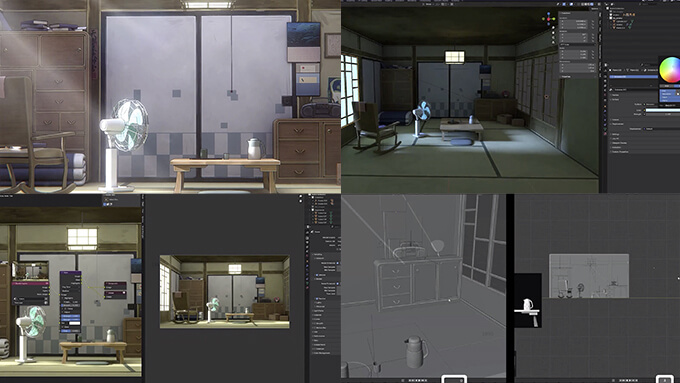 世界中のチュートリアル動画を販売しているWingfoxのサイトで、BlenderとSubstance 3D Painterを使用して、アニメ調の昔ながらの日本の和室シーンを朝・昼・夜と作成するチュートリアル動画が販売開始されました。