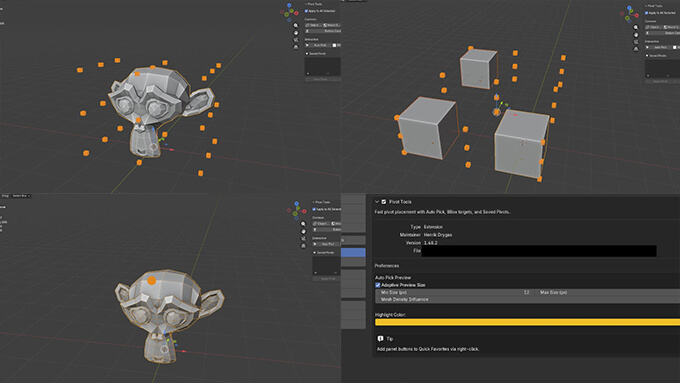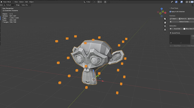 Pivot Toolsは、Blenderで選択したオブジェクトの境界に27個の黄色いポイントを表示して、選んだ部分にピボットを自動的に移動させたり、自分で選んだ頂点部分にピボットを移動、オブジェクトの下に1クリックでピボットを移動、ピボットの位置を保存していつでも呼び出しが出来るアドオンです。