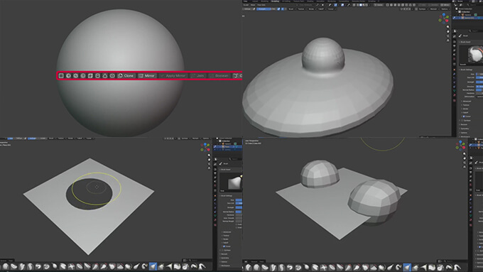 対称形状を作るためのミラー設定、削るためのブーリアン、メッシュに穴を開けるようなハードサーフェス的処理といった作業をモードを行き来せずに行える点が大きなメリットです。