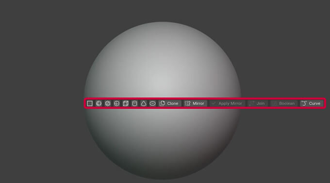 また、アドオンを追加するとスカルプト用のプリミティブメッシュを素早く作成できるアイコンや、カーブオブジェクトの追加、ミラーの設定、ブーリアン結合、穴あけ処理など、スカルプト中によく使う操作をUIから直ぐに実行できるようになります。
