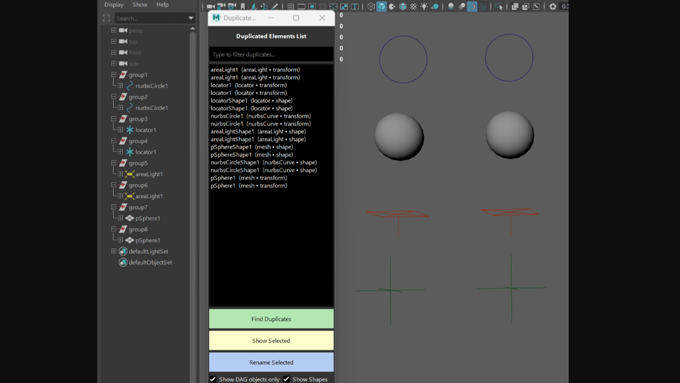 Duplicate Finderは、Julenさんが作成した、Mayaでシーン全体を対象に名前が重複しているノードを一括で検出できるツールです。作業中にOutliner上の名前を一括で検出し、命名ルールの揺れや重複をまとめて整理する用途にも使えます。