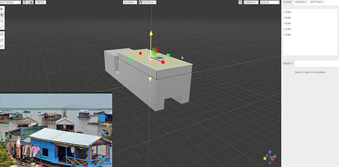 実際に使っている動画では、モデリングに特化されているので機能は少ないですが、ボックスからモデルを複製して面や頂点の移動に結合、ループカット、結合、原点の移動、オブジェクトモード、編集モード、数値による角度変更、ヒストーリ機能等を使用して水上家屋を作っている様子が確認できます。