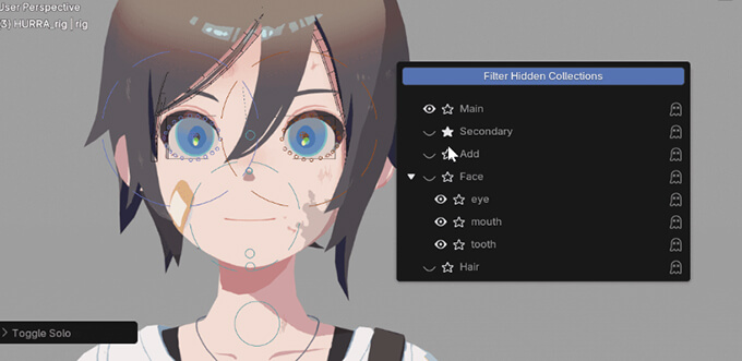 プロパティエディタに移動せずに、3Dビュー内からフィルタリング機能を使ってボーンを表示して管理する事が可能で、他のオブジェクトが選択されている状態でも、ポーズモードに入る事が可能です。