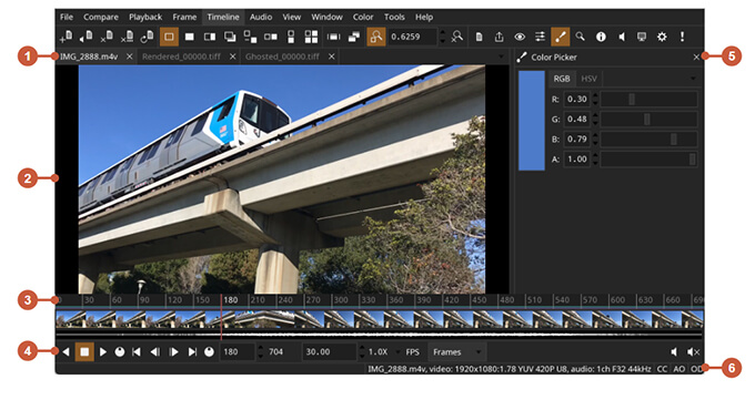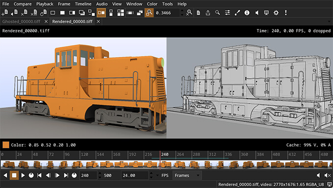 高解像度・高ビット深度画像に対応し、ワイプ/オーバーレイ/差分モードによるA/B比較、OpenTimelineIO対応のタイムライン、OpenColorIOによるカラー管理、可変速度・逆再生対応のマルチトラックオーディオ、USDファイルの実験的サポートを備え、Linux・macOS・Windowsで利用可能です。