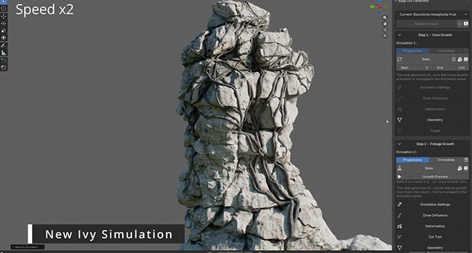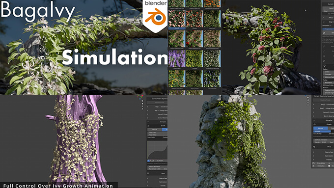 Baga Ivyは300種類以上の植物アセットと70種類のプリセットが収録されたBlender用アドオンですが、新機能としてモデルや建物にツタを絡ませてシミュレーションモードが追加されたBaga Ivy Simulationがリリースしました。