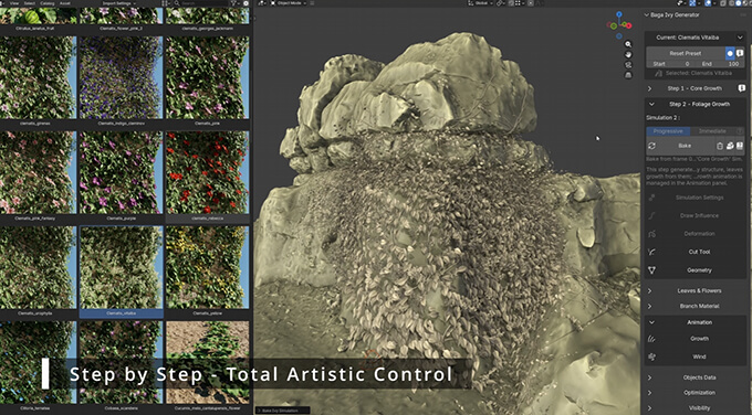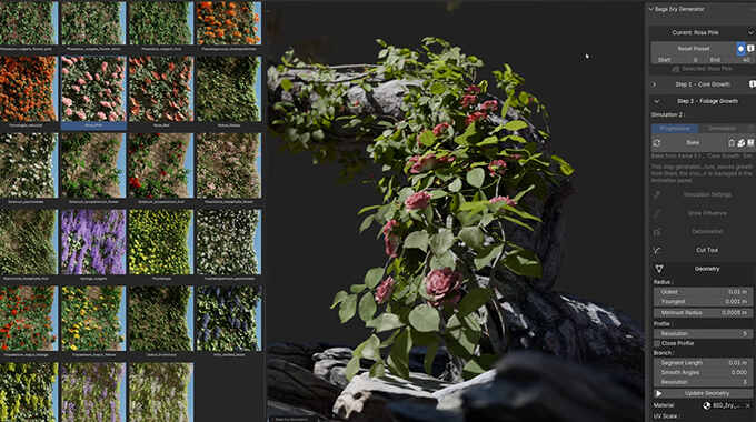 徐々にツタが伸びて成長していくアニメーションを作成でき、最終的な形をコントロールしながら、どこまで伸びるか、どのように広がるかを細かく調整可能です。また、ツタと一緒に花が徐々に開くリアルな開花アニメーションも追加され、最終結果はベイクすることもできます。植物は適当なものではなく実在する種類と同じものとなっています。