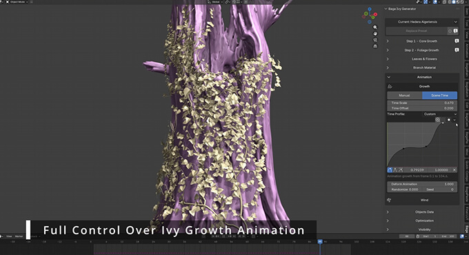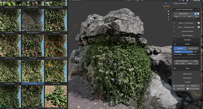 また、ツタの成長アニメーションはプロファイルカーブで編集でき、葉や花のマテリアルも透け感や質感が向上しており、風で揺れる動きも表現可能です。プロキシ表示で重いシーンでも軽量に作業可能で、最終的に高品質に生成する事も出来ます。