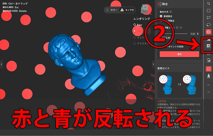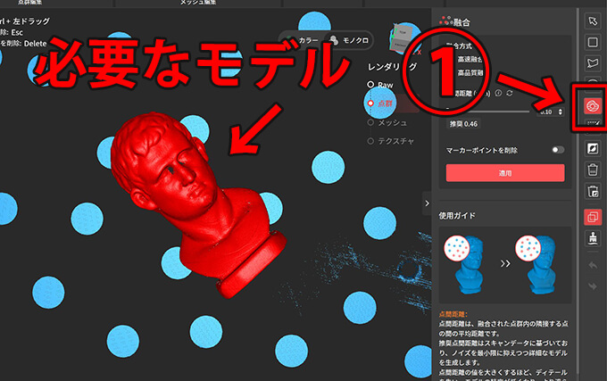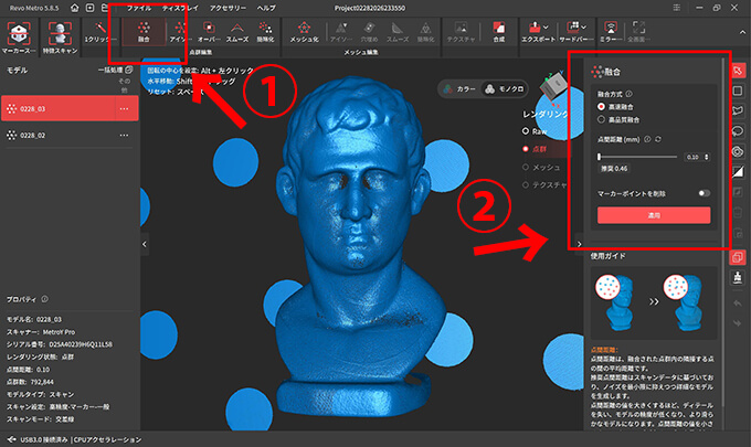 スキャンが完了したら、①融合をクリックして、②高速融合を選び、点間距離の数値は0.1にしました。(数字が低いほど細かい表示が可能になります)