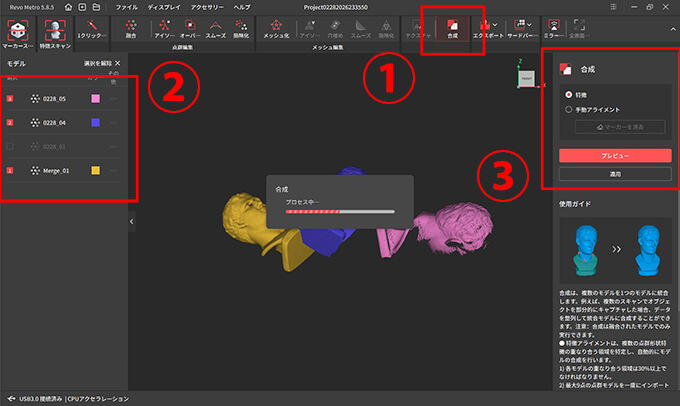 正面、よこ、後ろなど複数の角度からスキャンしたモデルを、アプリの ①「合成」を押して、②スキャンした複数モデルを選択、③特徴からプレビューを押すと、
