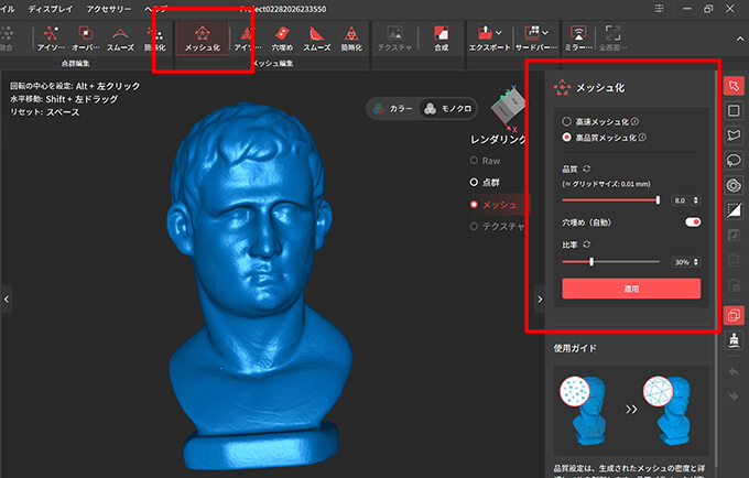 最後に「メッシュ化」を押して、高品質メッシュ化からサイズを適宜調整、「穴埋め」にチェックを入れることで小さな穴など埋めた綺麗なモデルが完成出来ます。