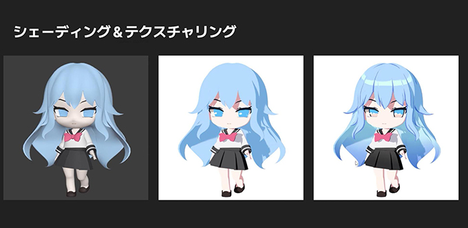 服の表現では、アニメ調によるシンプルな表現、UVを使ったグラデーション、テクスチャペイントによる描き込みなど、デザインに合わせて表現方法を使い分ける方法を学ぶことができました。アウトラインを作る方法や、髪にハイライトや影を描いて立体感を出すテクニックも紹介されていて、見た目を一段良くするポイントが理解できます。