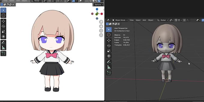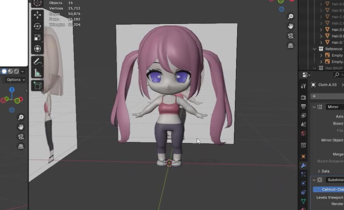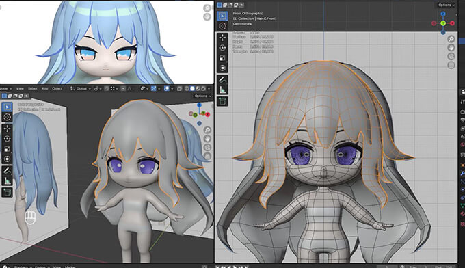 実際にキャラクターモデリングしていく講座では、リファレンス画像を配置して1から作っていきますが、単なるモデリング作業だけではなく、かわいく見える比率やデフォルメのポイントについて解説してくれます。