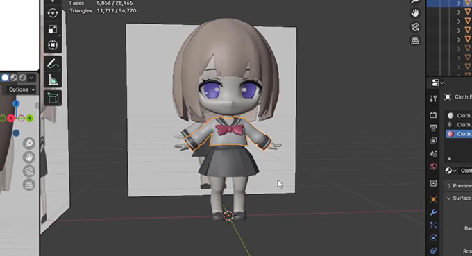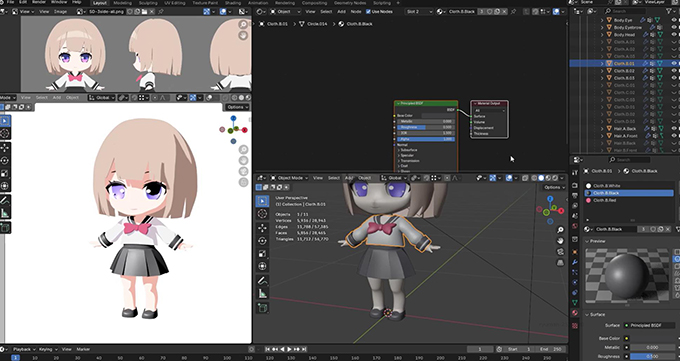 衣装のモデリングでは、スポーツウェア・制服・パーカー短パンの普段着・ドレスの複数の衣装をBlenderで作る流れを学びまが、どの衣装も最初に作った人体のメッシュをベースにしているので、ゼロから作るよりも短時間で素材を流用して作るコツを学べます。