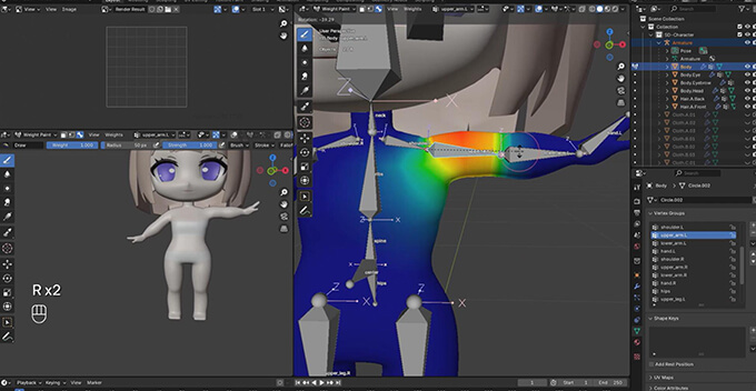 次に、作成したボーンに合わせて体・髪・服にウェイトを設定し、実際にポーズを取れるようにする流れが学べます。体は自動ウェイト機能を使ってボーンの影響を自動で割り当て、服は体のウェイト情報をコピーして手作業を減らしながら効率よく設定します。