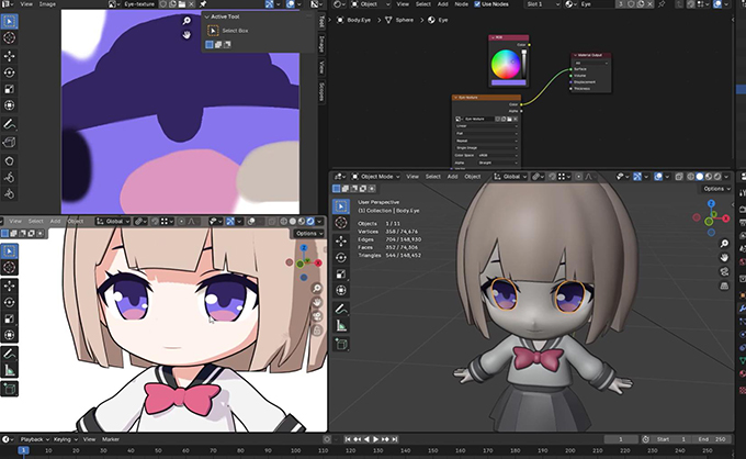 目はUVを調整しながらハイライトや影を描き、単色のシェーダーだけでなく、テクスチャを組み合わせてより情報量のあるキャラクターに仕上げる方法を解説しています。
