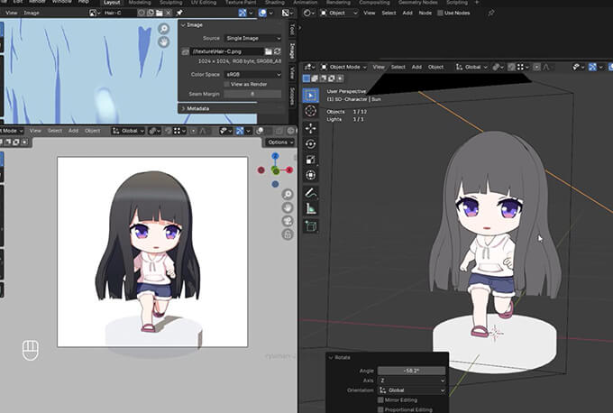 Eeveeやカラーマネージメントの設定、色を調整するノードを使い、明るい色と影色をくっきり分けたアニメ風の質感を作っていきます。さらに、環境の設定やライトの調整まで含めて、Blenderで見たままの色を出しやすくする方法を学びます。