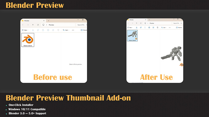 Blender3.0~5.0以降で動作可能で、Windows10/11で使用可能。表示するにはエクスプローラーのアイコンを「大きい」または「特大」にする必要があり、サムネイルが直ぐに表示されない場合はF5キーを押してフォルダの更新をしてみる必要があります。