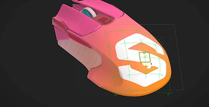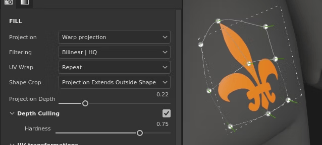 ワープ投影を使用している時にコンテキストツールバーのトグル(ボタン)を有効にすると、デカールがメッシュの曲率や形状に自動でフィットするようになります。
