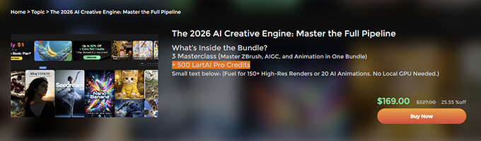 The 2026 AI Creative Engine: Master the Full Pipelineには、ZBrushによるスカルプトに、AIを使用したアニメーション制作の2つのマスタークラスと、AI生成ツールで使用できるLartAI Pro Credits(500クレジット)が含まれて、定価227ドルが今だけ169ドルで販売されています。
