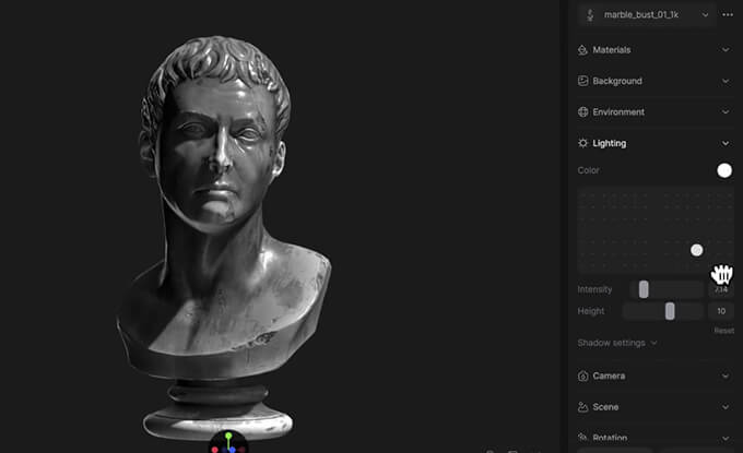 これまではサービス内に用意された3Dオブジェクトを使用する形が中心でしたが、今回のアップデートによりGLB形式の3Dモデルをアップロードしてシーン内で自由に使用することが可能になっています。アップロードしたモデルは、位置・回転・スケールの調整だけでなく、マテリアルの変更やテクスチャの差し替え、ライティングや背景の調整なども行うことができます。