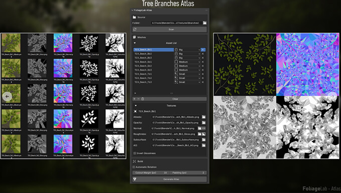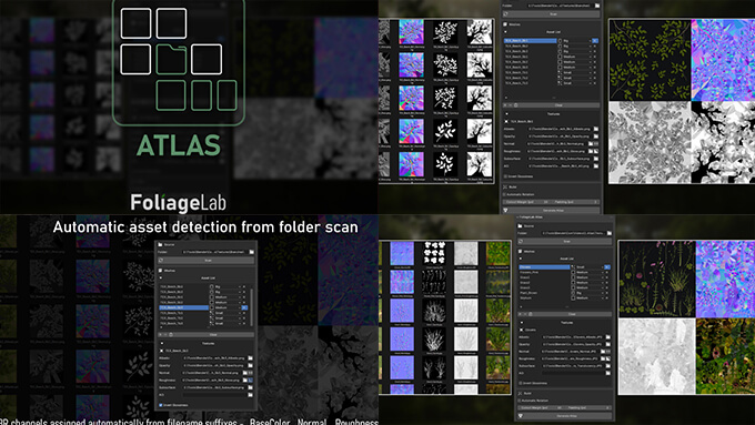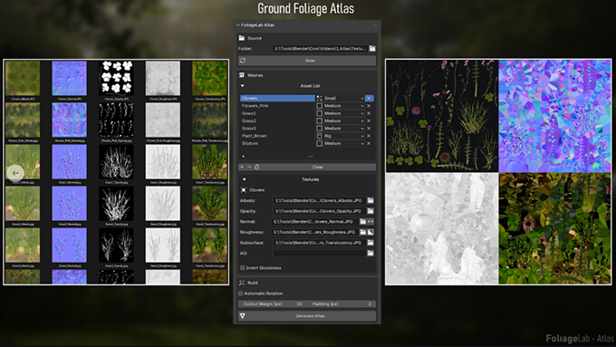 FoliageLab – Atlasは、Blenderで草や葉などのPBRテクスチャを自動検出し、複数の素材を1枚のテクスチャアトラスとしてまとめて整理できるアドオンです。