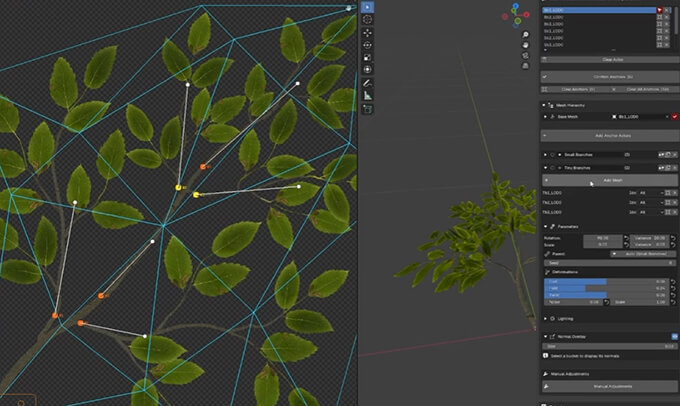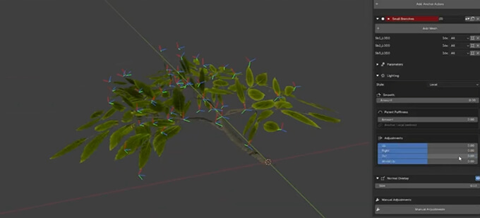 ライティング調整機能も用意されており、頂点法線を調整することで葉の光の当たり方をコントロールすることができます。法線の向きをWorld Up方向にブレンドしたり、ビューポート上で法線を確認しながら調整することも可能です。
