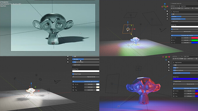 Cinematic Studio Proは、Blenderで選択したモデルに8種類のプリセットライトからワンクリックでモデルにライトを配置、さらにモデルが移動してもライトが追従、周りのライトの大きさ変更、ライトの強さ、回転・ライトをランダム変更・それぞれのライトは個別にモデルの方向に向けさせて調整出来るアドオンです。