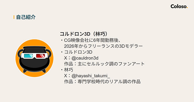 コルドロン3D(林巧)さんは、CG映像会社に6年勤務後、現在はフリーランスの3Dモデラーとして活躍しているお方で、リアルからセルルック調のプロップやキャラクター制作に関わってきた経験があります。