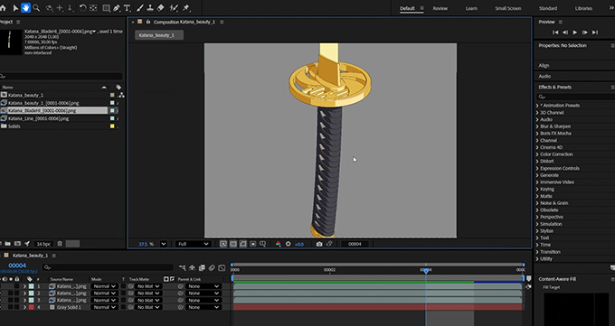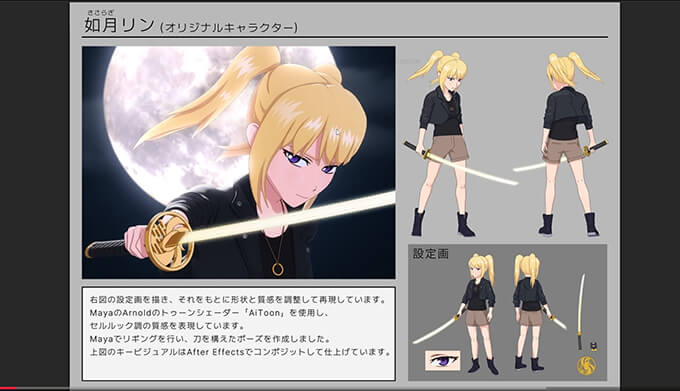 質感設定では、トゥーンらしい見た目に設定する方法から、AOVを使ってラインや刃の発光用素材を別出力することで、後のコンポジット作業に備えた素材分けや、完成した刀モデルを扱いやすくするために簡易的なコントローラーを作成する方法も解説。