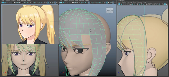 髪の毛は曲線ラインで作られていて、人体の中でも手数が掛かり大変な部分ですが、まずは前髪・ベース・後ろ髪の3つに分けて作る流れが解説されています。