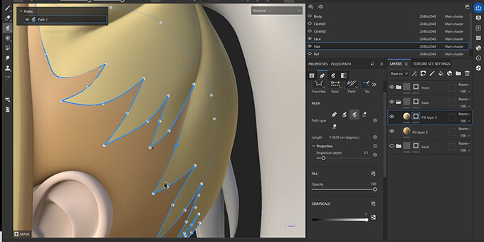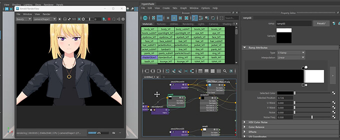 Substance PainterやPhotoshopを使ってベースカラー・シャドウ・ハイライト・ラインマスクなどを作成し、それをMayaのマテリアルに組み込み、パーツごとにテクスチャを管理しながら、調整していきます。