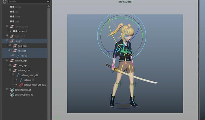 ポージングでは、刀を手に自然に持たせるためにロケーターやコンストレインを使って位置を固定し、指の関節を調整しながらしっかり握っている形を作る工程が紹介されています。
