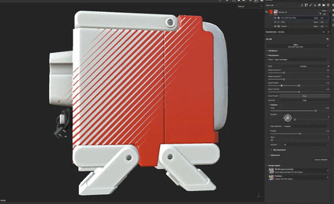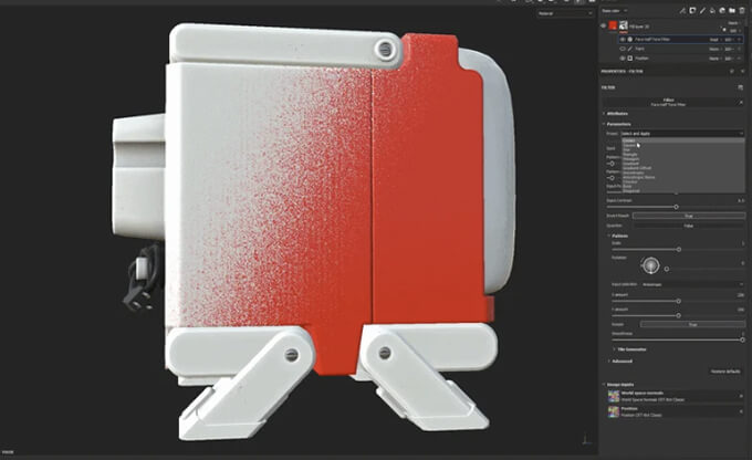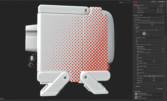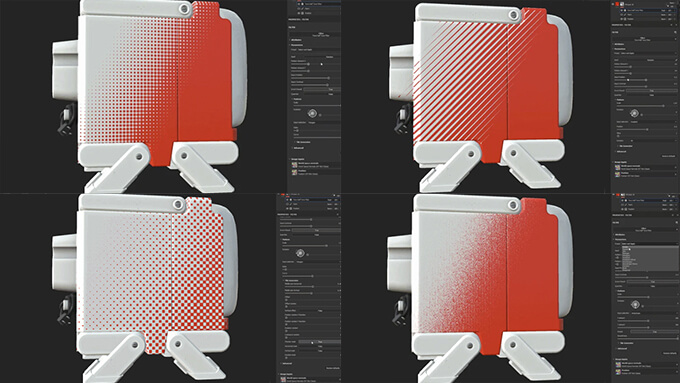 ドットサイズや密度を調整可能で、フィルターには12種類のプリセットが用意されていて、パターン制御や、カスタムパターン入力が可能。Substance 3D Painter 9.1.0以降で使用可能です。