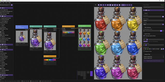 Photoshop、GIMP、krita、illustrator、Affinityからドラッグアンドドロップで画像をインポートして、ノードを繋げて、アイコンやテクスチャ、スプライトなどのバリエーションを自動生成でき、大量の画像を書き出す作業を効率化できます。